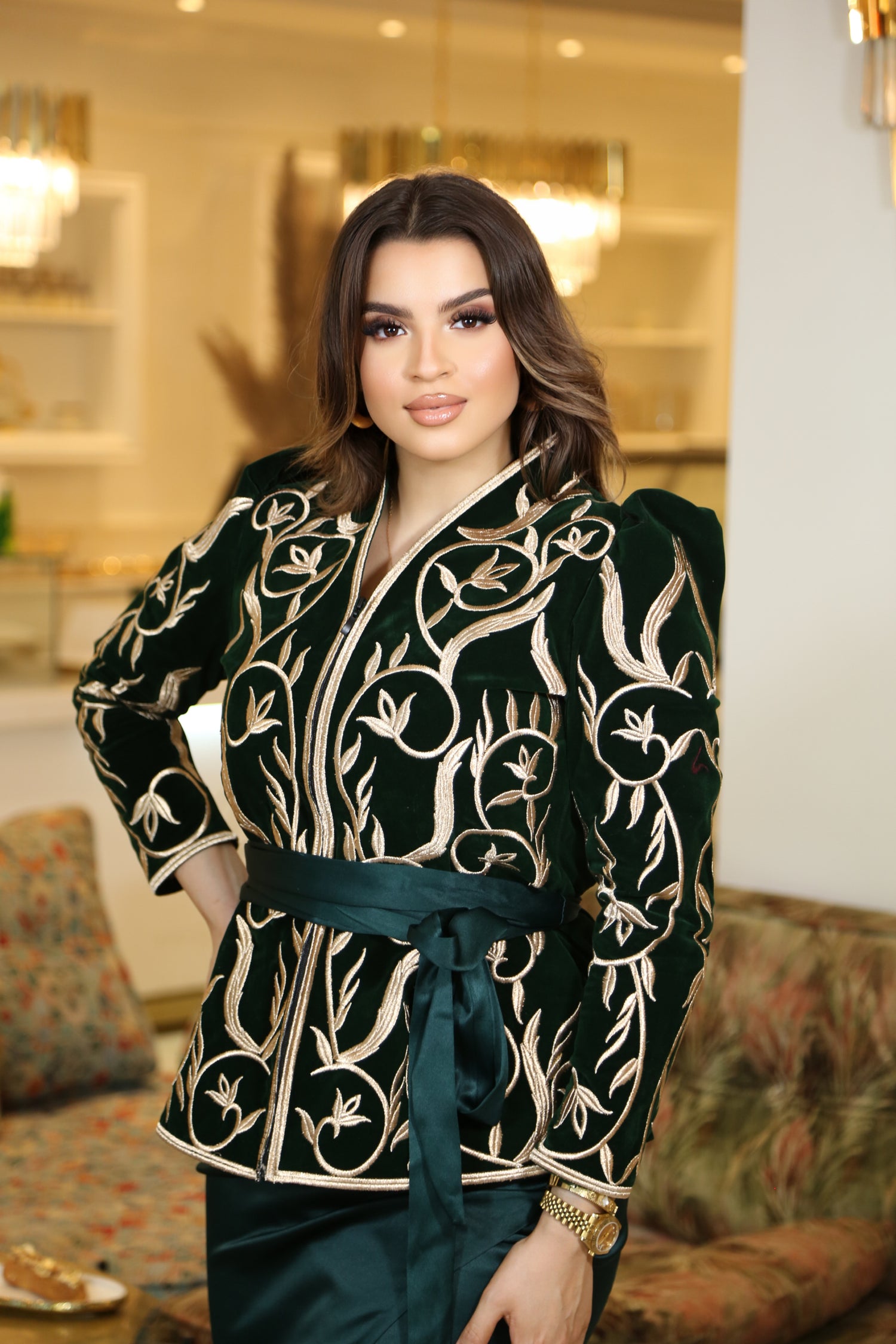 “حين تلتقي الفخامة بالتفاصيل، تولد أناقة لا تُنسى. كل خيط ذهبي يحكي قصة، وكل نظرة تعكس ثقة امرأة تعرف قيمتها.”